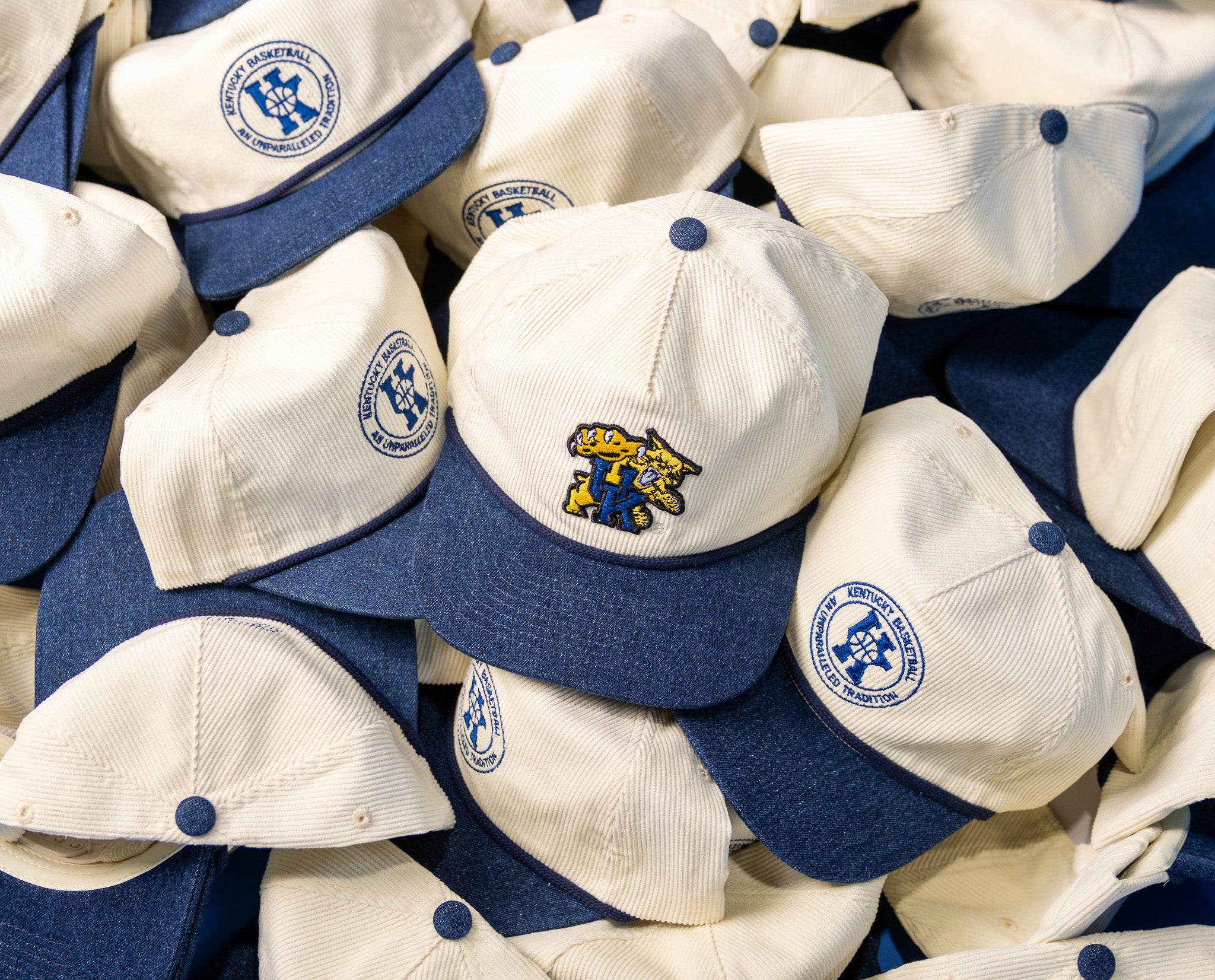 - Blue corduroy hat with white rope